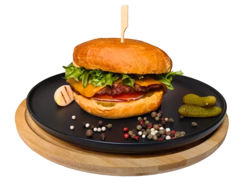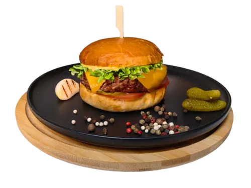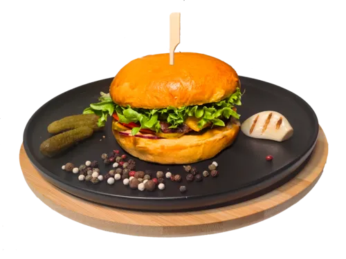 Состав: булочка, бургеры, сыр Чеддер, помидоры свежие, огурцы маринованные, лук красный, салат Айсберг, соус фирменный для бургера.