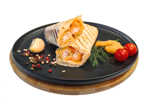 Изысканное сочетание жареной креветки в панировке, соуса Том Ям и фирменного сливочно-чесночного соуса, а также свежих овощей. Готовится в тортилье. 230гр.