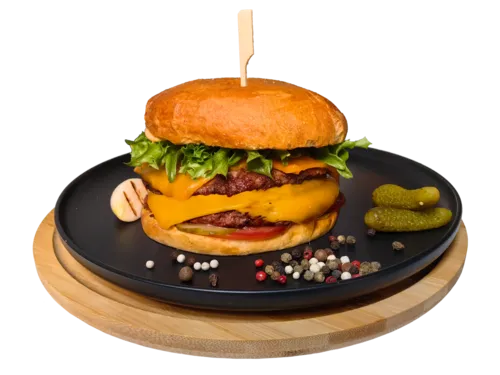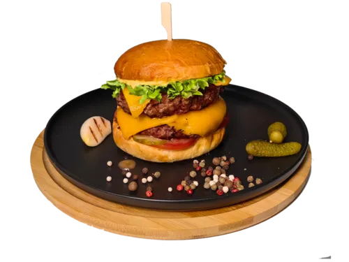 Двойной бургер из говядины, прожарка Медиум Велл, с сыром Чеддер на булочке бриошь, 380гр.
