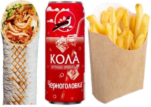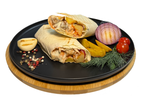 Состав: лаваш, филе куриной грудки, соус сливочно-чесночный, картофельные дольки, помидоры, огурцы маринованные, лук красный.