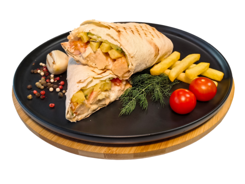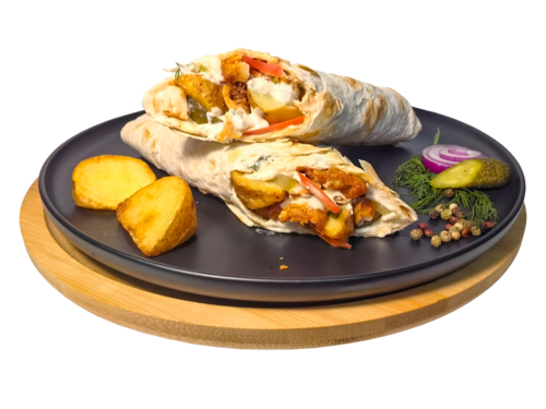 Состав: лаваш, филе куриной грудки, соус сливочно-чесночный, картофельные дольки, помидоры, огурцы маринованные, лук красный.