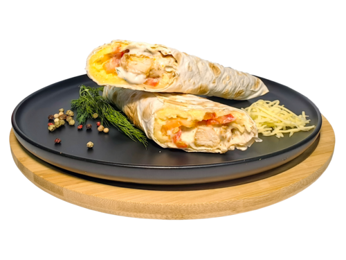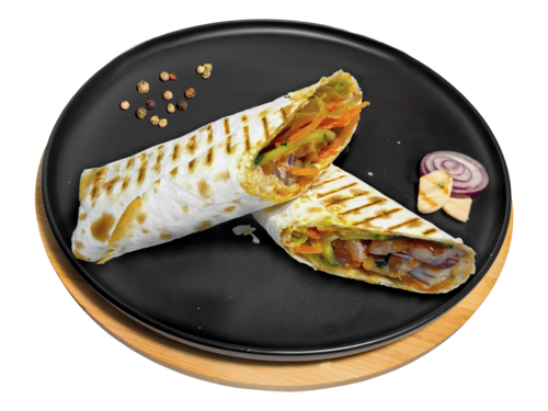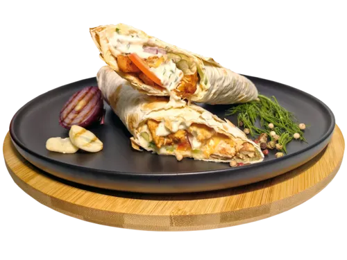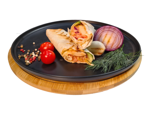 Состав: тортилья, филе куриной грудки, сыр, помидоры, соус сливочно-чесночный.