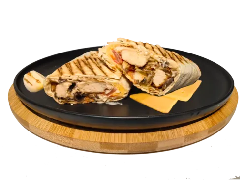 Состав: тортилья, филе куриной грудки, шампиньоны гриль, сыр, соус фирменный сливочно-чесночный, помидоры.